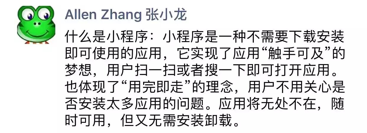 张小龙在朋友圈里这样解释道:小程序是一种不需要下载安装即可使用的应用,它实现了应用「触手可及」的梦想,用户扫一扫或搜一下即可打开应用。也体现了「用完即走」的理念,用户不用关心是否安装太多应用的问题。应用将无处不在,随时可用,但又无需安装卸载。