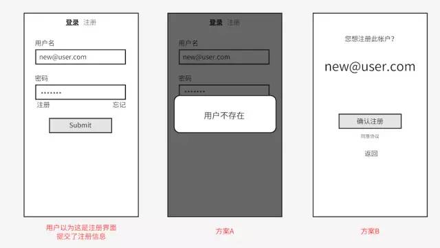 在上图中,我们会看到 A 方案的做法是告知用户「用户不存在」,这属于有一说一。当然,出于安全策略等原因,目前更流行的做法是提示「用户名或密码错误」。