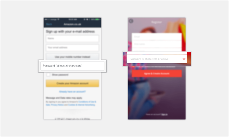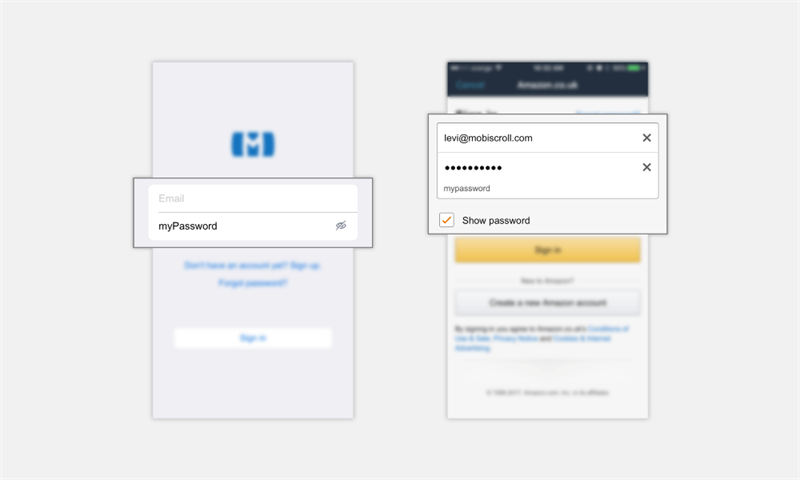 可以考虑让密码可见。这对用户登录和注册有帮助。不用再次输入确认,用密码输入框来切换显示隐藏,帮助用户确认首次输入是否正确。显示和隐藏的功能可以用一个小图标、一行文字标签、或者勾选框来表示。亚马逊对此做了些小变化,把隐藏字符保留在输入框里,在下方显示完整密码。增强了用户的信心,减少焦虑,表达出密码被妥善处理的事实。